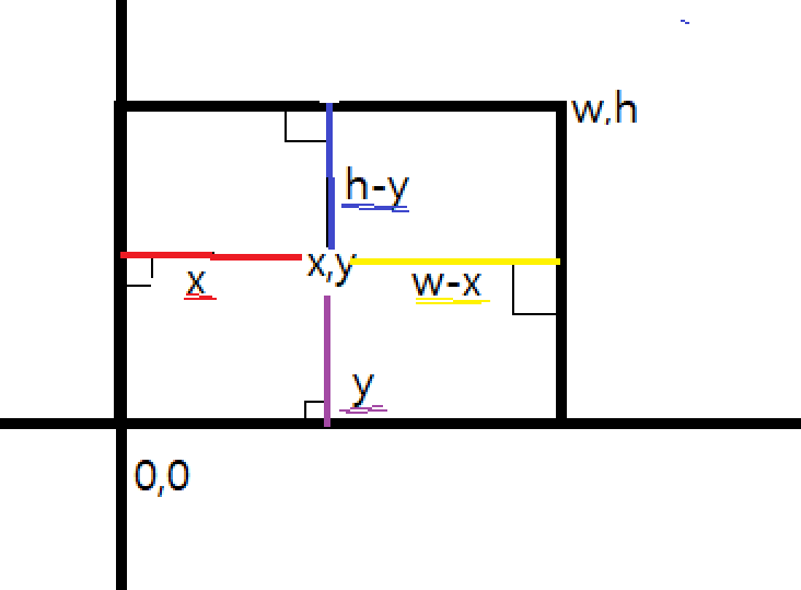 0,0으로 시작해서 기울지 않는 예쁜 직사각형이기 때문에 오른쪽 가로는 w-x 왼쪽 가로는 x 위쪽 세로는 h-y 아래쪽 세로는 y이다.
